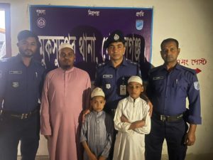 মেহের মামুন, গোপালগঞ্জ: বাড়ি থেকে পালিয়ে আসা দুই শিশুকে উদ্ধার করে পরিবারের কাছে হস্তান্তর করেছে মুকসুদপুর থানা পুলিশ। শনিবার গীভর রাতে মুকসুদপুর কলেজ মোড় নামক স্থান থেকে তাদের উদ্ধার করে মুকসুদপুর থানা পুলিশ। পরে ঐ শিশুর পিতার নিকট তাদের হস্তান্তর করা হয়। মুকসুদপুর থানা সুত্রে জানাযায়, ফরিদপুরের সালথা উপজেলার উজিরপুর গ্রামের মোস্তাফা আল হুসাইনের দুই শিশু সন্তান আব্দুর রহমান (১২), মোস্তাফিজুর রহমান (১০), ফুফুর বাড়িতে বেড়াতে যাওয়ার কথা বলে সকাল বেলা বাড়ি থেকে বেরহয়। এরপর তারা বিভিন্ন জায়গায় ঘুরে বাসযোগে মুকসুদপুর কলেজ মোড়ে এসে নামে। তারপর দুইজনে পুনরায় কমফোর্ট লাইনের বাস কাউন্টারে এসে ঢাকামুখী বাসে উঠার প্রাককালে জনৈক যাত্রী তাদের সাথে অভিভাবক না দেখতে পেয়ে ৯৯৯ এ কল করেন। তার প্রেক্ষিতে মুকসুদপুর থানার এস আই রাকিবুল ইসলাম সেখানে গিয়ে বর্নিত দুই শিশুপুত্র কে উদ্ধার করে জিজ্ঞাসাবাদের পর্যায়ে তথ্য সংগ্রহ পূর্বক তার পরিবারের সাথে যোগাযোগ করেন। পরে দুই শিশুপুত্রের বাবা মুকসুদপুর থানায় আসলে তার নিকট তাদেরকে হস্তান্তর করা হয়। মুকসুদপুর থানার ওসি মো. আবু বকর মিয়া জানান, বাড়ি থেকে পালিয়ে আসা দুই শিশু সন্তানকে মুকসুদপুর থান পুলিশ উদ্ধার করে তাদের নিকট হস্তান্তর করেছে। শিশুদের জিজ্ঞাসাবাদের পর্যায়ে পুলিশ আরো জানতে পারেন যে সৎ মায়ের অনাদর ও আত্যাচারে উক্ত দুই শিশু সন্তান বাড়ি ছেড়ে পালিয়ে যাচ্ছিল। থানা পুলিশের মাধ্যমে পালিয়ে যাওয়া দুই সন্তান কে ফিরে পেয়ে তার বাবা মুকসুদপুর থানা পুলিশের প্রতি কৃতজ্ঞতা ও ধন্যবাদ জ্ঞাপন করেন।