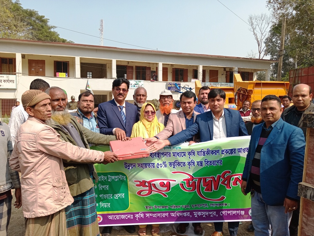 গোপালগঞ্জের মুকসুদপুর উপজেলার প্রান্তিক কৃষকদের মাঝে ২২-২৩ অর্থ বছরে উন্নয়ন সহায়তায় ৫০% ভর্তুকীতে কৃষি যন্ত্র বিতরণ উদ্বোধন করা হয়েছে।